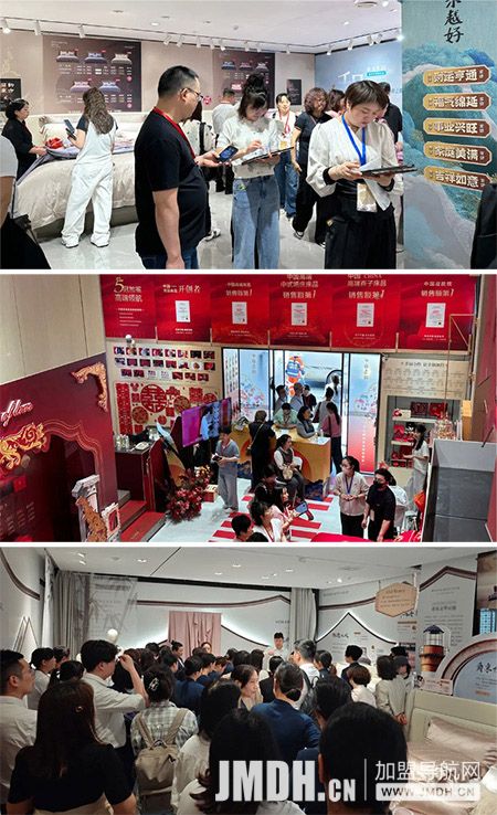 定货现场氛围高涨,人潮涌动。25秋冬定货会展位设计独具巧思,新品璀璨纷呈。通过各系列创意的氛围营造,将新品的卖点可视化展现为来自全国各地的加盟商们献上了一场床品艺术的美学盛宴。